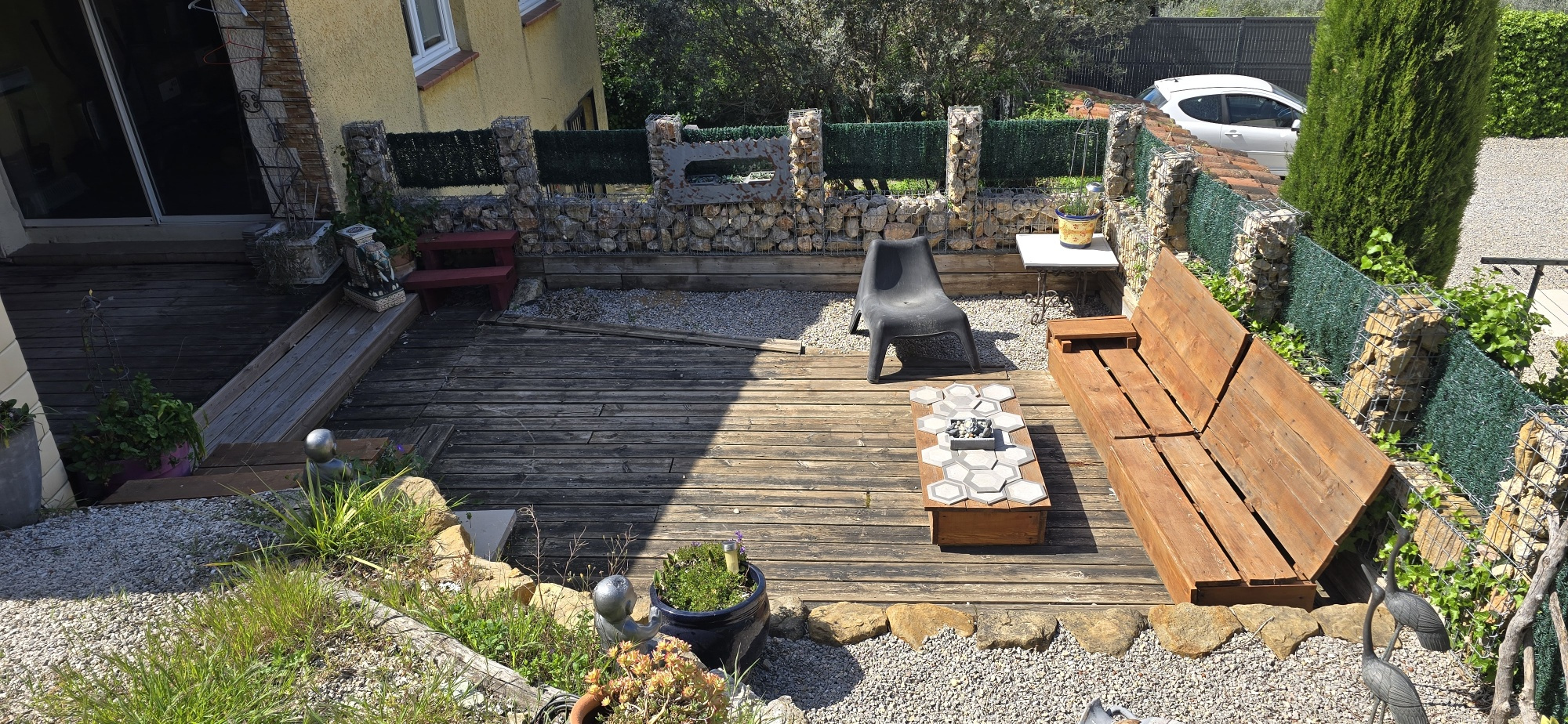 Rez de jardin : T2 de 46m² loué 700 € avec jardin, terrasse et parking, Maison : entrée, 3 chambres, bureau, cave.