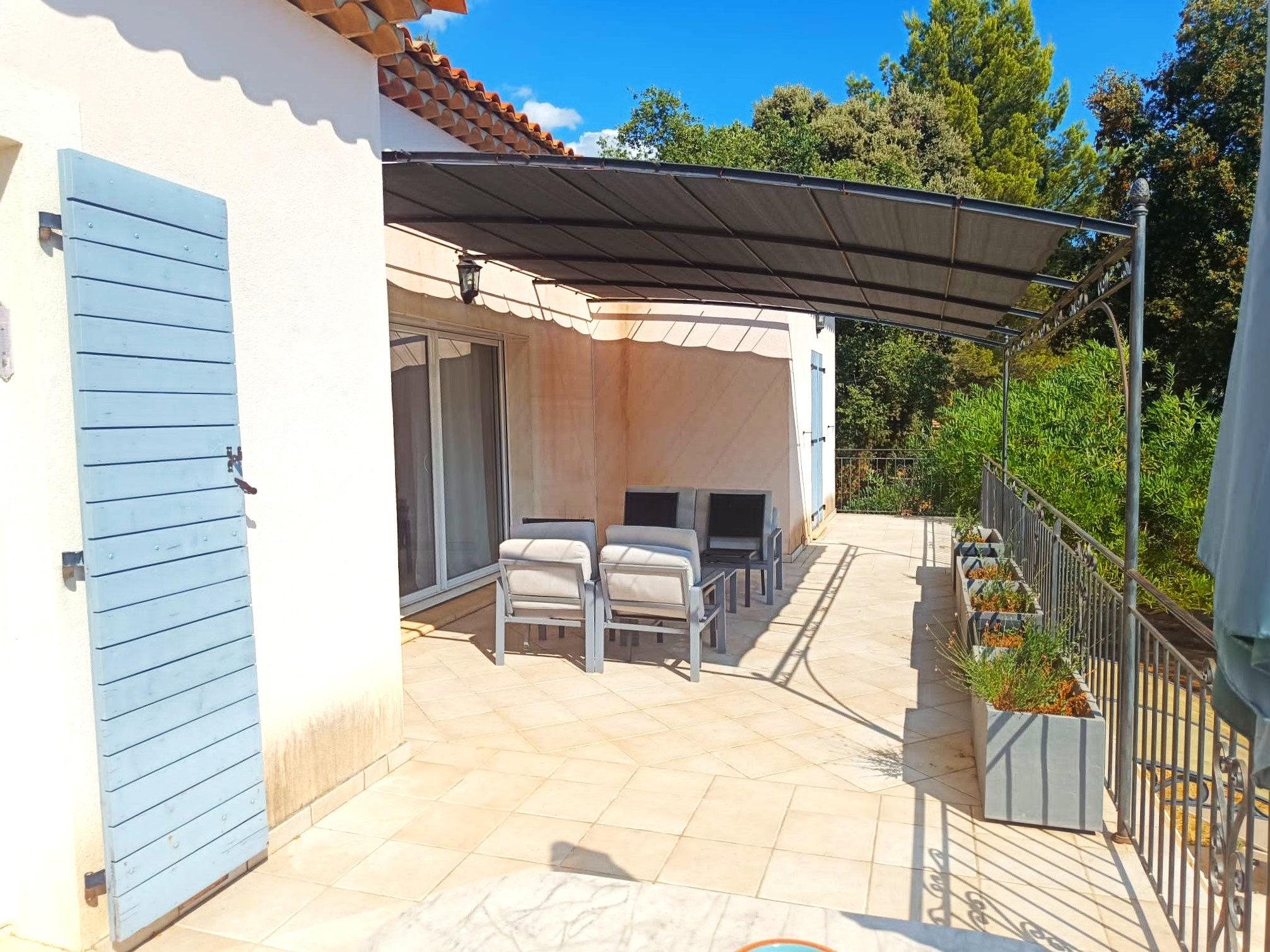 Superbe villa T4 de 2011 de 138 m² plein sud, composée d'un grand séjour-salon avec cheminée, belle cuisine aménagée et équipée, trois chambres dont une suite parentale, buanderie, toilettes. Grand sous-sol de 70 m² aménageable, clim gainée dans toute la maison, panneaux solaires. Terrain paysager clos de 2100 m² avec oliviers et verger, piscine au sel chauffée de 8x4 m avec plages (2015).